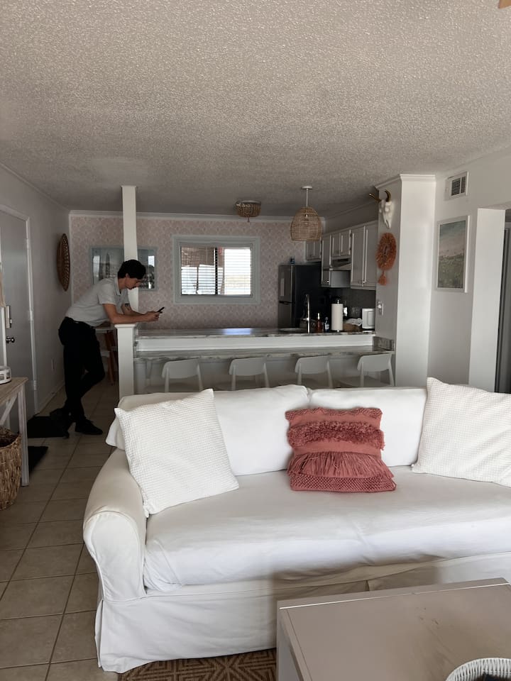 The space sleeps four across two bedrooms. The primary bedroom has a king bed, a private en-suite bath, and an ocean view that makes waking up before sunrise feel like something you actually want to do. The second bedroom has two twin beds, perfect for kids or friends. Both rooms are fully equipped and ready for you on arrival. The open-concept living area flows directly onto the private oceanfront balcony.